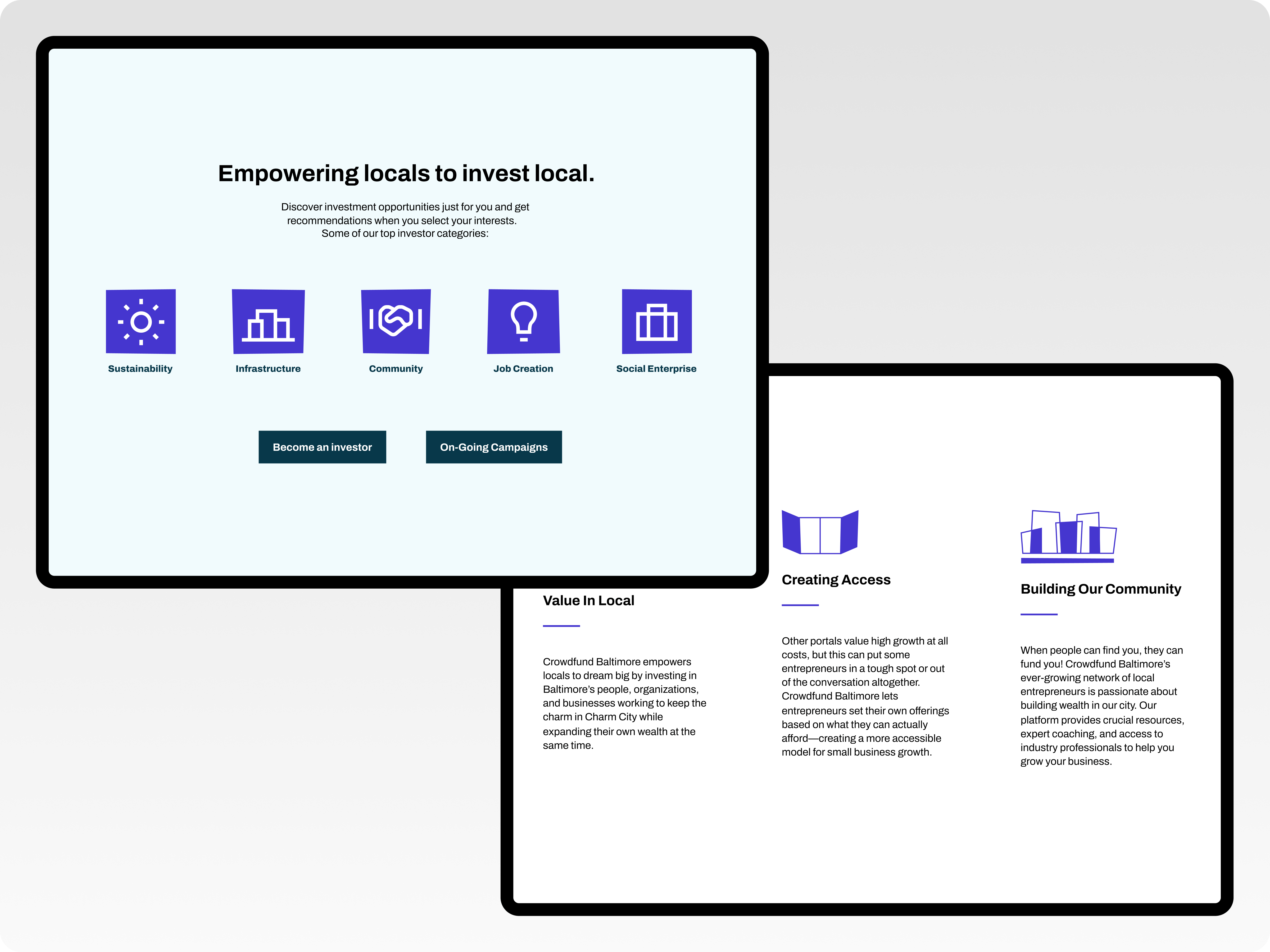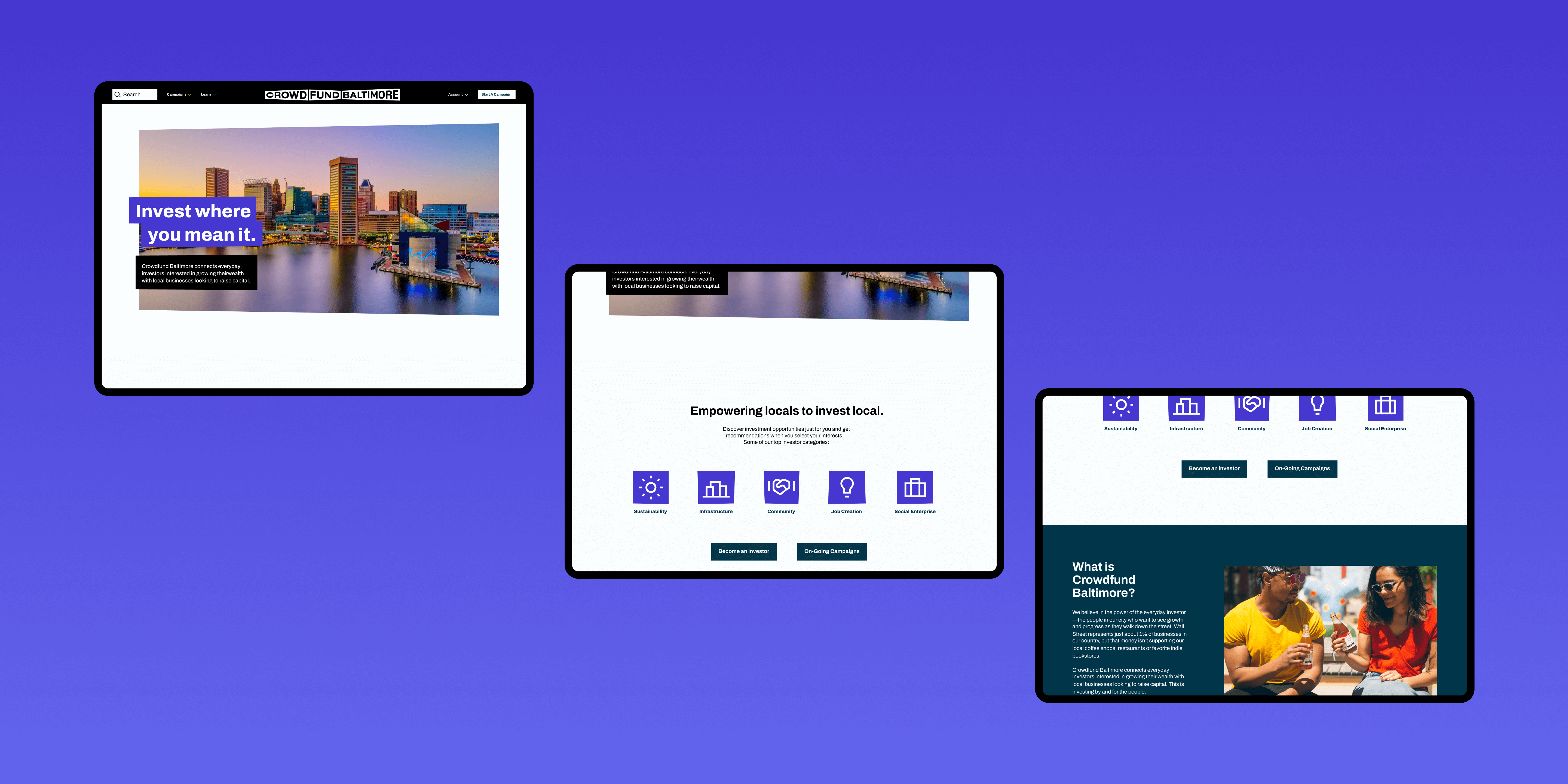 These sections were added to showcase the categories of local investments as well as CTAs targeted to both businesses and investors. Prospective investors and entrepreneurs will feel compelled to either invest or use Crowdfund Baltimore as a way to gain funding.