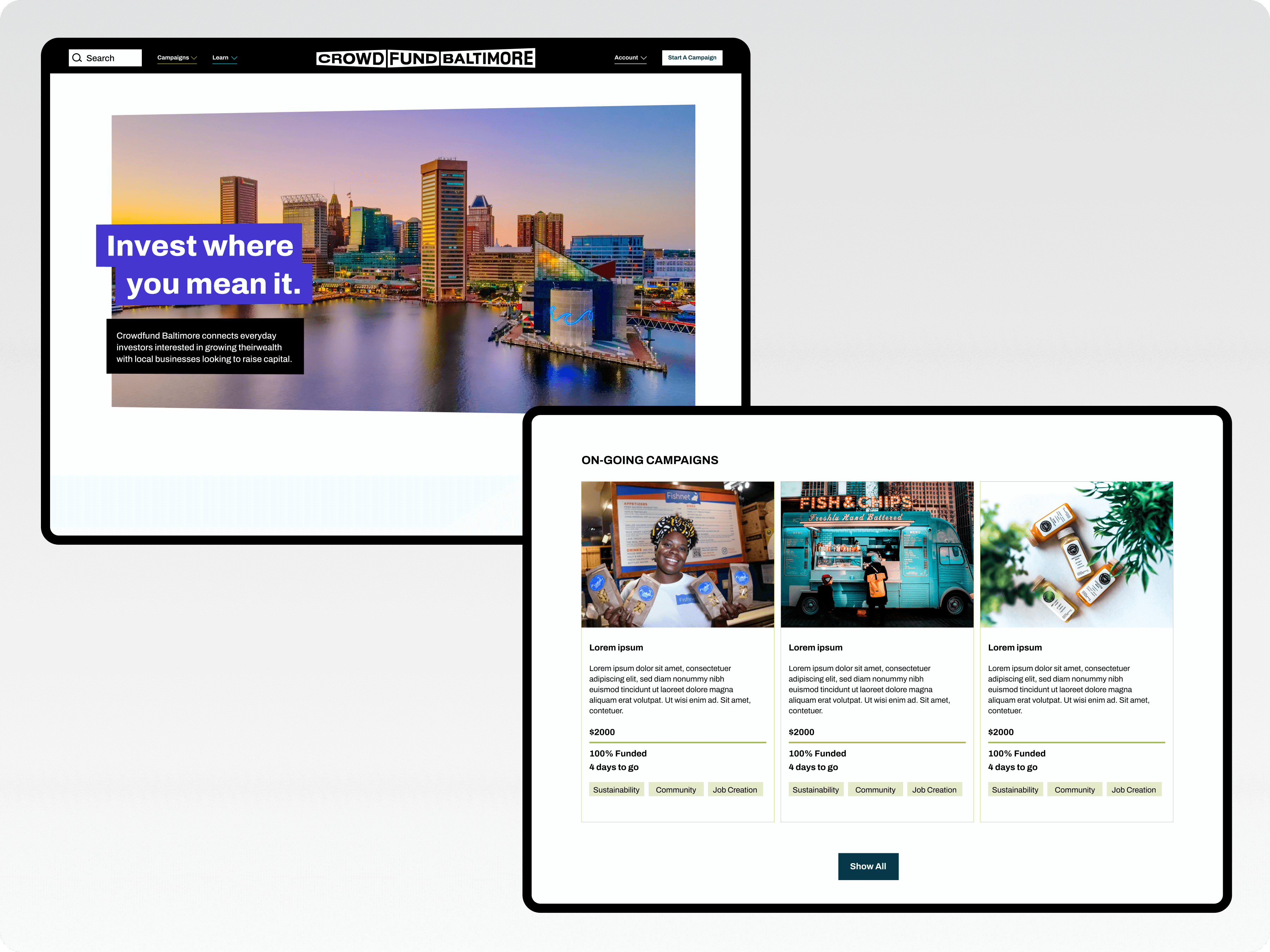 Crowdfunding Baltimore is a sub division of Crowdfund Mainstreet. They are creating a Baltimore specific website and want the design to reflect the city.